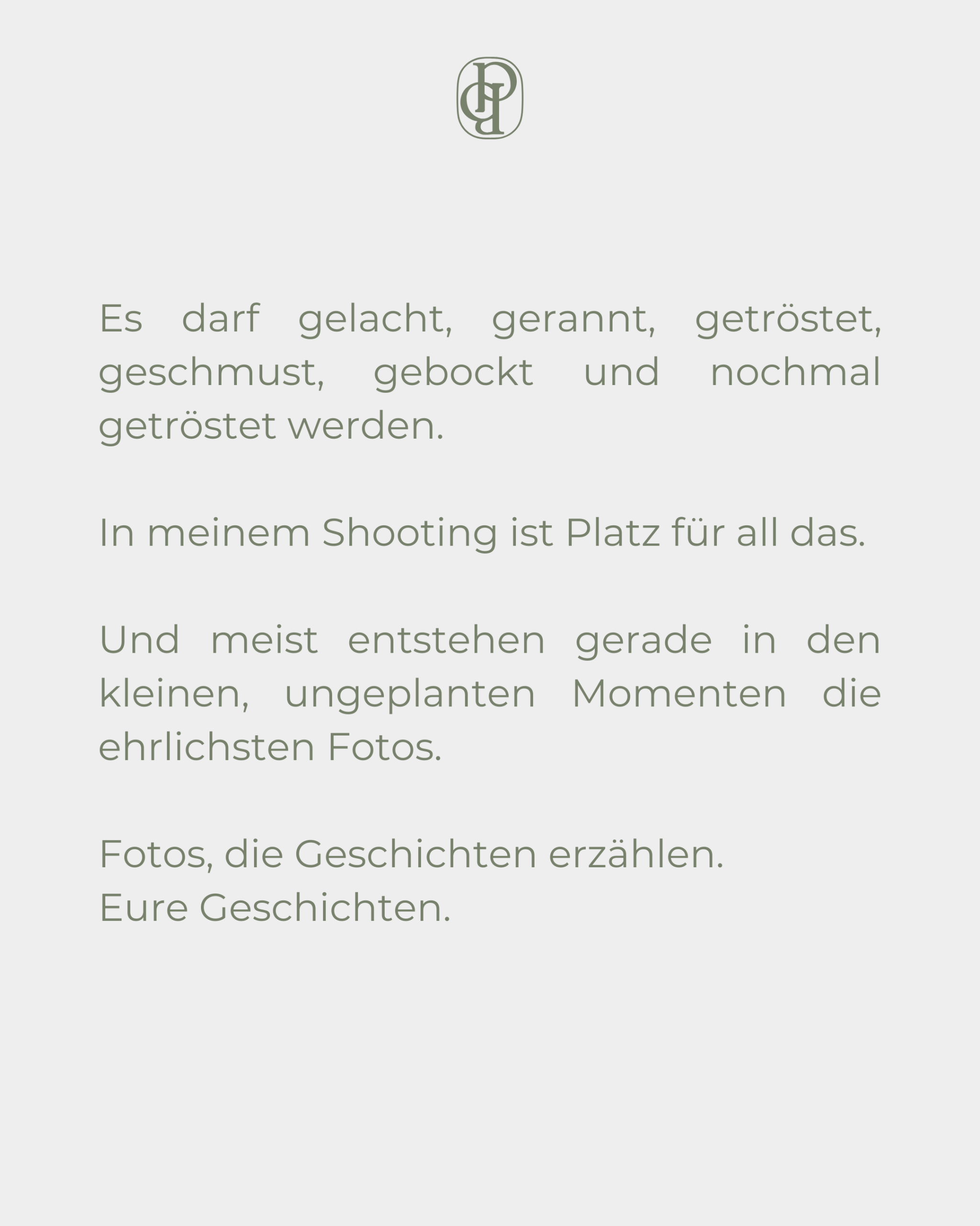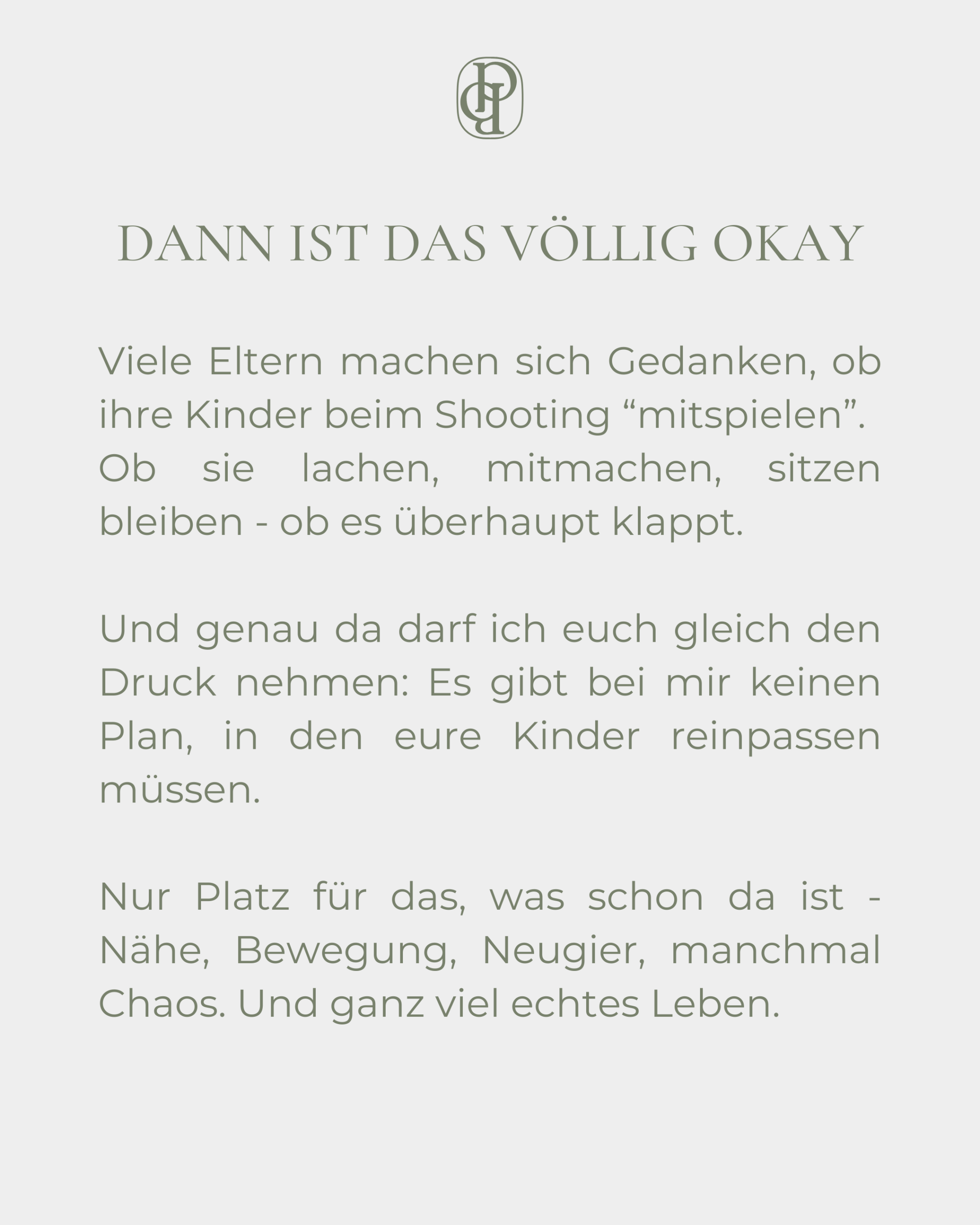 Diese Sorge haben viele Eltern. Durch eine gute Vorbereitung und mit viel Empathie, Zeit und Geduld gebe ich euren Kindern den Raum, Kind zu sein. Ich vermeide steife Posen, aufgefordertes Lachen und stillhalten. Kinder dürfen in meinen Shootings rennen, toben, kuscheln oder das tun, was sich für sie richtig anfühlt.